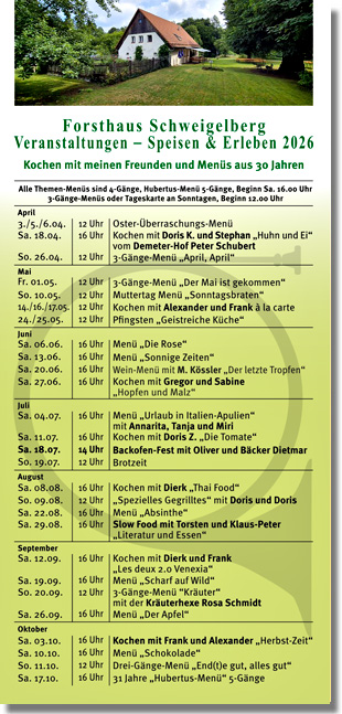 Die Teilnahme an unseren Events, wie den Themenmenüs nach unserem Veranstaltungskalender, erfordern aufgrund der aufwendigen Vorbereitungen eine feste Vorbestellung mit Ihrer Adresse und Telefonnummer. Gebuchte Veranstaltungen können nur kostenpflichtig (Menüpreis) storniert werden! Dafür wird Ihnen eine Rechnung erstellt. Bitte haben Sie dafür Verständnis. Danke.